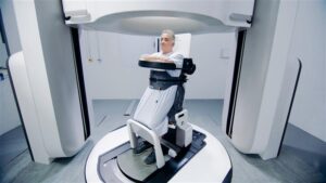 従来の陽子線治療では患者は寝台に寝た状態で治療を受けていたが、立位型陽子線治療システムでは患者は立った姿勢、あるいは座った姿勢で受けることができる。