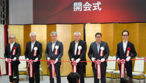 ここで、田中大臣官房審議官と文部科学省の福井俊英大臣官房審議官、日本分析化学学会の山本博之会長、米国大使館のダニエル・ルー上席商務官、足立会長、長谷川会長の6 人がテープカットを行い、JASIS2025は開幕した。
